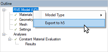 Use the Context Menu of the RVE model in the Outline to export the definition of the RVE model to an hdf5 exchange file format. This option is not available for Analytical Models.