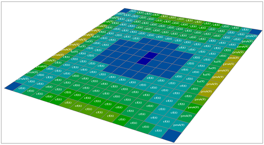 The sandwich panel modeled in this tutorial is shown below. The contour and text plots on the model indicate the solution's failure criteria, outputting the inverse reserve factor (IRF) that measures the composite failure with critical values ranging from one and upward.