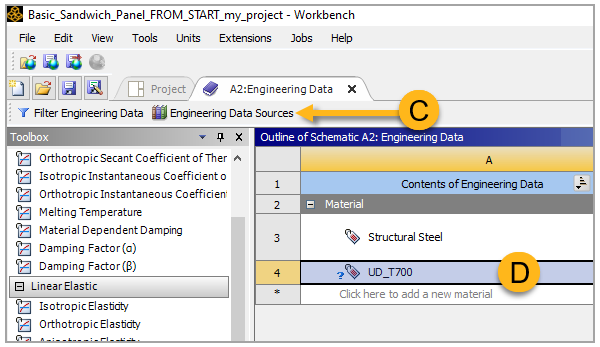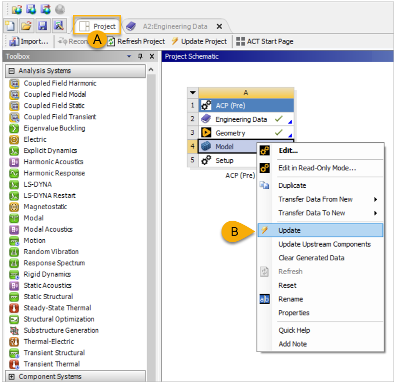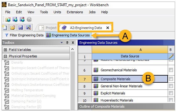 As shown below, select Engineering Data Sources (A). Select Composite Materials (B) from the Data Source list.