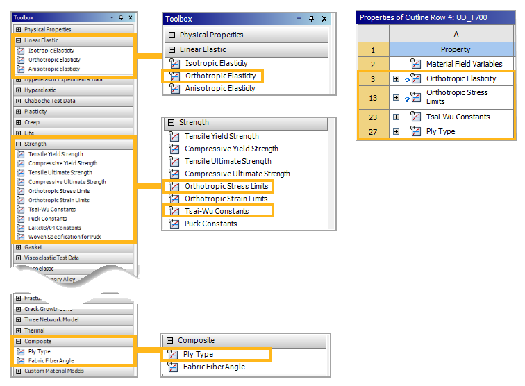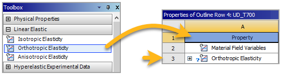 You will now create a new unidirectional (regular) material by dragging the required properties from the Toolbox onto the Properties cell as shown in the image below.