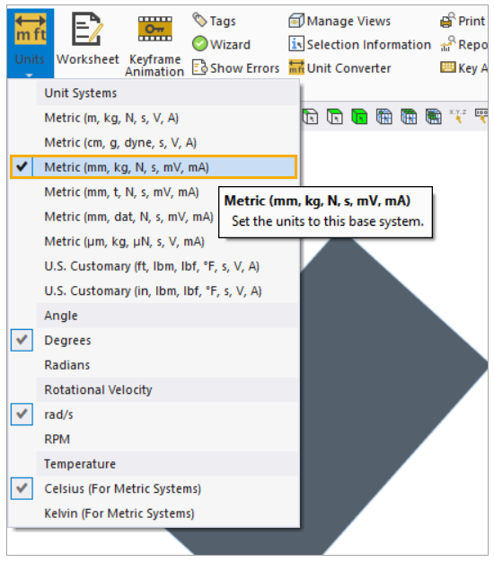 If needed, set the units to the millimeter base system by clicking the Units icon on the toolbar and selecting Metric (mm, kg, N, s, mV, mA).