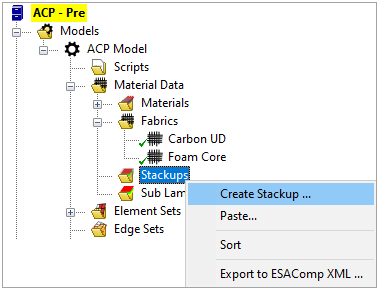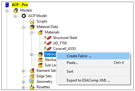In ACP's Tree View, under Material Data, right-click Fabrics and select Create Fabric.