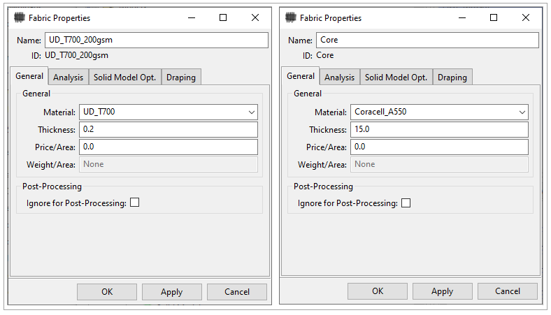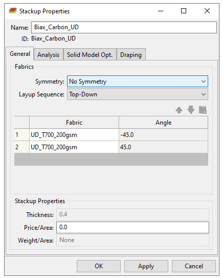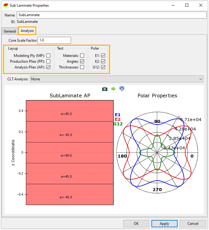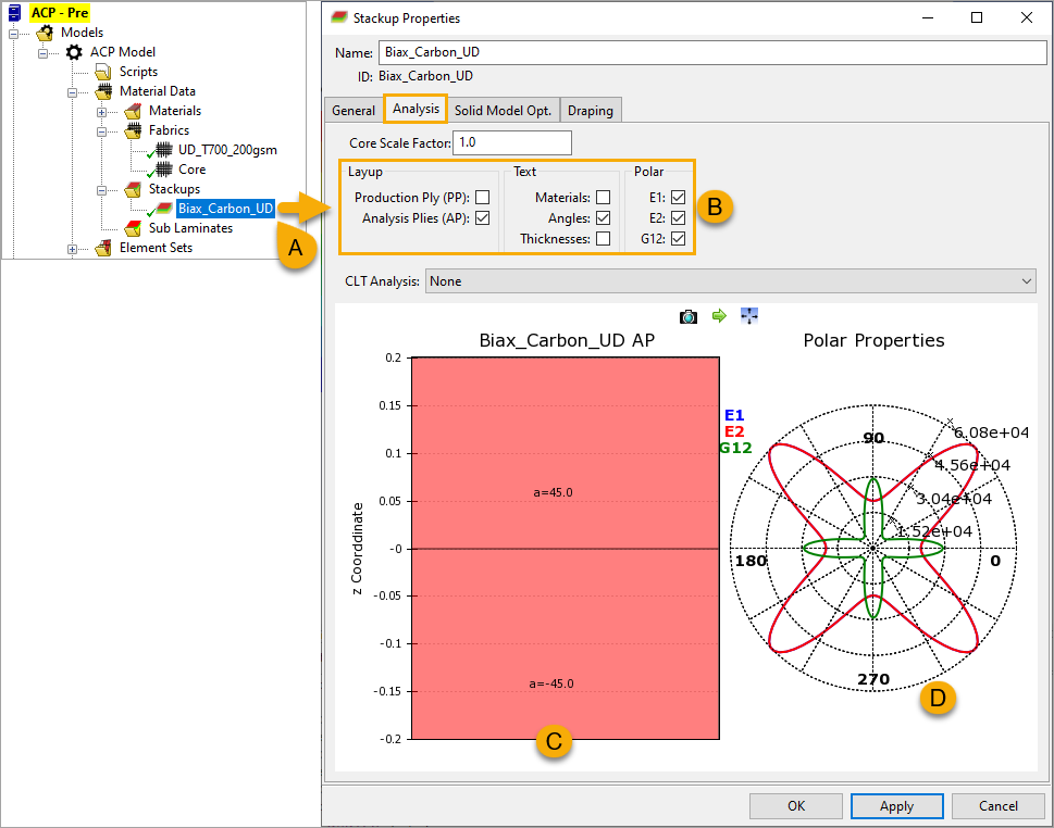 Biax_Carbon_UDstackup. Select the following analysis options as shown below (B):Under Layup, select Analysis Plies (AP).