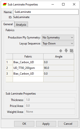 Combine the UD Biax Carbon stackup and UD T700 fabric into one Sub Laminate as shown below. Click Apply.