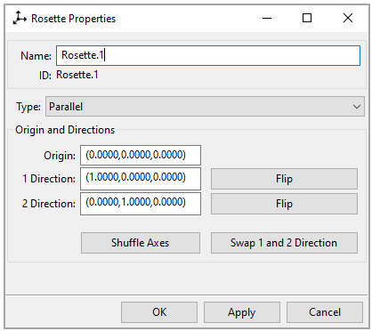In the Rosette Properties dialog, specify the Origin (location of the rosette) and the 1 Direction and 2 Direction (the x and y directions of the rosette). There are two ways to do this: by manually entering the coordinates in their respective fields or by selecting a direction vector for the rosette. For the latter, hold Ctrl and select two element nodes. The direction vector aligns along the line between the two select element centers' respective nodes.