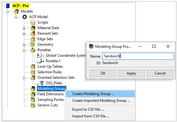 In the Tree, right-click Modeling Groups and select Create Modeling Group. In the Modeling Group Properties dialog, enter