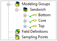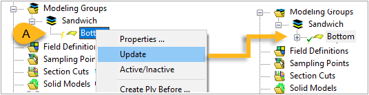 If you performed the previous steps correctly, the bottom ply will appear in the Tree under Modeling Groups/Sandwich. The lightning icon next to the Bottom ply (A, below) is a reminder to update the visual model so it reflects the changes. To do that, right-click Bottom and select Update from the context menu. The lightning icon will change to a green checkmark.