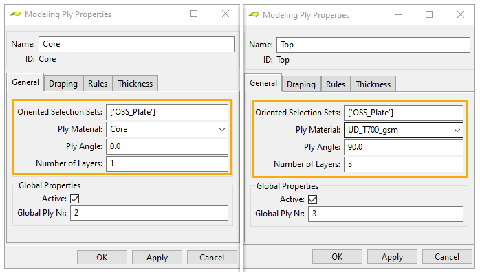 Ply Name Orientation Selection Sets Ply Material Ply Angle Number of Layers Notes 1 Bottom OSS_Plate Sublaminate 0.0 1 One sublaminate consisting of stackup, fabric, stackup. 2 Core OSS_Plate Core 0.0 1 One core fabric 3 Top OSS_Plate UD_T700_200gsm 90 3 Same UD Fabric, 3x