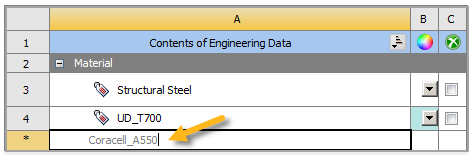 Click Engineering Data Sources (C) to unhighlight that section. Then, under Contents of Engineering Data, manually add the name of the new material,