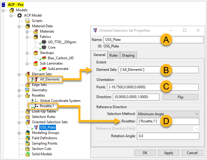 ACP uses the Oriented Selection Set (OSS) as part of the layup definition. The orientation direction of the OSS specifies the stacking direction of the modeling ply. The reference direction specifies the direction all ply angles are relative to.
