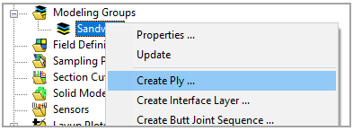 Right-click the new Sandwich group in the Tree and select Create Ply. This opens the Modeling Ply Properties dialog.
