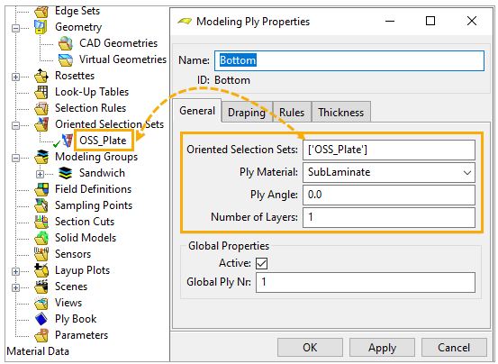You will create three plies. Begin by creating the Bottom ply. In the Modeling Ply Properties dialog, enter the properties as shown in the image below. For the Oriented Selection Sets field, put the cursor in the field and click OSS_Plate in the Tree. When you have completed all the specified fields, click OK.