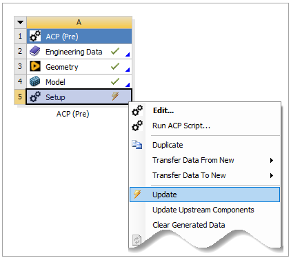 Right-click the Model cell in the ACP (Pre) system, select Clear Generated Data, then click OK when the warning dialog pops up.