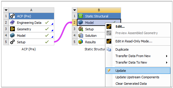 Return to Ansys Workbench, right-click the Model cell, and select Update in the context menu.