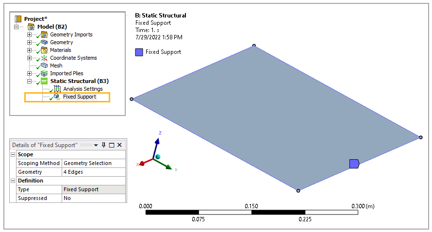 Insert a Fixed Support to the system. Then add it to the edges of the panel by choosing the select icon in the toolbar. Click the first edge and select the Apply Selection icon. Add the other three edges to the Geometry scope by clicking on them and selecting the Add To