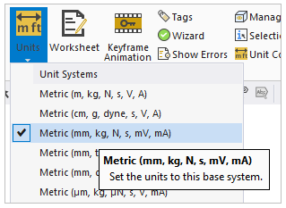 In Mechanical, select Units from the Home tab and choose Metric (mm, kg, N, s, mV, mA).