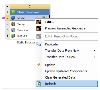 Right-click the Model cell in the Static Structural system and select Refresh, then double-click the cell to open Mechanical.