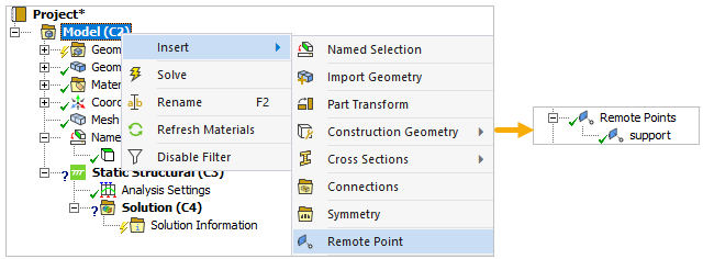 Create a Remote Point by right-clicking Model, then selecting Insert and Remote Point. Rename it to