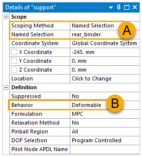 In the Details pane, select Named Selection from the Scoping Method drop-down menu, then select rear_binder for the Named Selection (A, below). Choose Deformable as its Behavior (B).