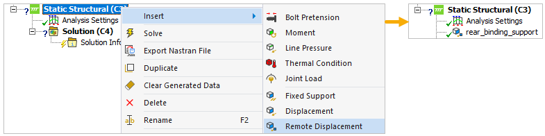 Create a Remote Displacement by right-clicking Static Structural, then selecting Insert and Remote Displacement. Rename it to