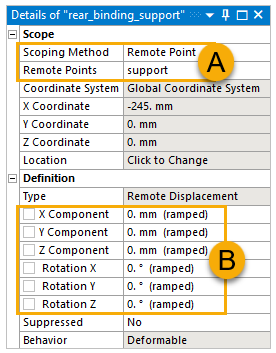 In the Details pane, define the Scoping Method and the Remote Points as shown in the image (A, below), then specify the other values like below (B).