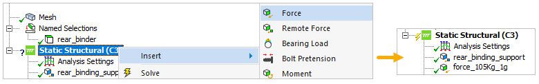 Create a force by right-clicking Static Structural, then selecting Insert and Force. Rename it to