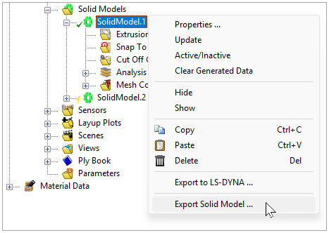 From the context menu of Solid Model or Imported Solid Model, you can export the model as an LS-DYNA keyword *.k file.