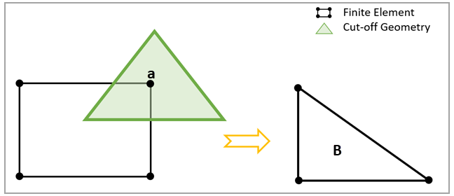 The sketch below illustrates how the Cut-Off Geometry Feature works: A node (a) of the finite element is within the Cut-Off Geometry, so it is removed from the element. But no additional nodes are added where the element edges intersect with the Cut-Off Geometry. Instead, the element is converted into a degenerated shape (B), in this case from a quad to a triangle. This also happens for 3D elements (prisms and hexes).