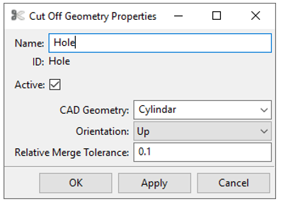 The following properties must be defined in the Cut-Off Geometry Properties dialog: