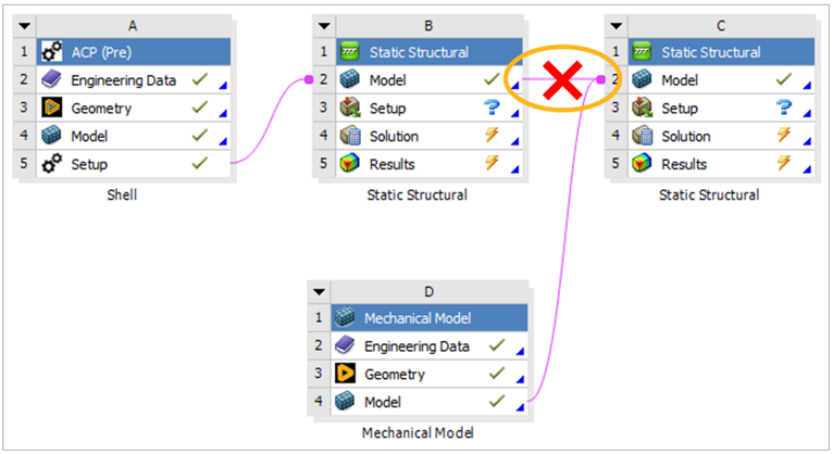 A connection from an upstream ACP (Pre) Setup or Mechanical Model cell is only possible if the Engineering Data cell of the intended downstream Mechanical system is not modified. If the Engineering Data cell of the downstream system is modified by creating/modifying an existing material in the Engineering Data interface, a data transfer cannot be created.