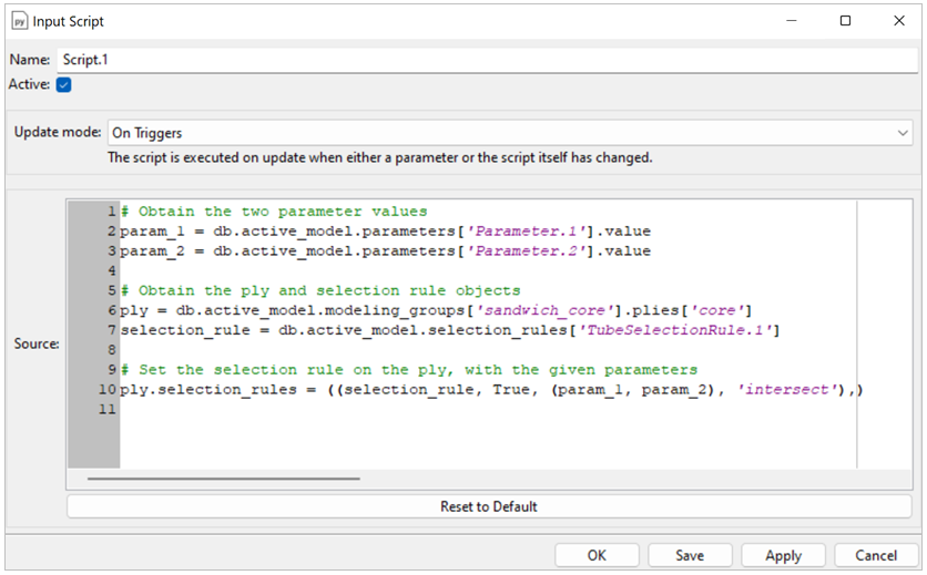 In addition to the default buttons (OK, Apply, and Cancel), the Script has a Save button which saves the modifications without closing the window or updating the model.
