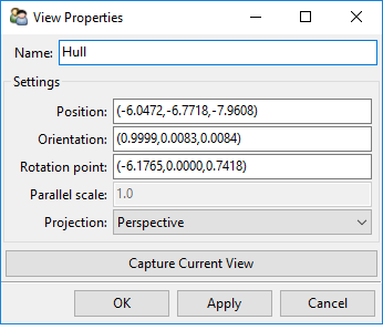 Views can be used to save a certain view. The selection of a view automatically updates the Scene and transfers the properties of the View to the active Scene. New Views can be created with the button in the toolbar (see Scene Manipulation) or via the object Tree. Different parameters can also be defined manually.