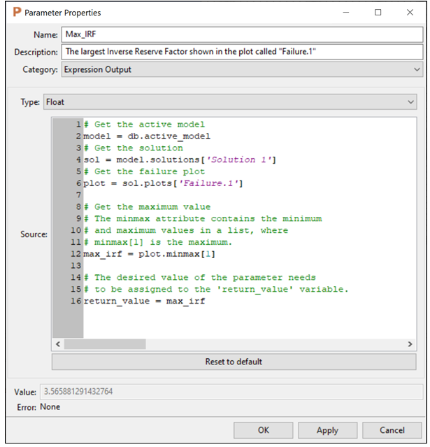 An example of a simple expression output is shown here. In it, the maximum inverse reserve factor is retrieved from the active contour plot.