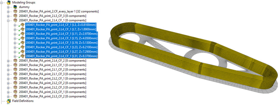 The following figure shows the Workbench Project Schematic. The 3D geometry of the printed composite part (shown above) is loaded into system A (Solid Mesh) and meshed in SpaceClaim. Three Named Selections are defined in Model A4 which are used to define the forces and supports later in the analysis system C3. This is important if you want to have an associative model. The material properties (such as stiffness and strengths) are defined in the Engineering Data component (B2) of the ACP Pre system. The solid mesh is transferred to ACP Pre by linking Model A4 with ACP Setup B5 which results in an Imported Solid Model in ACP Pre.