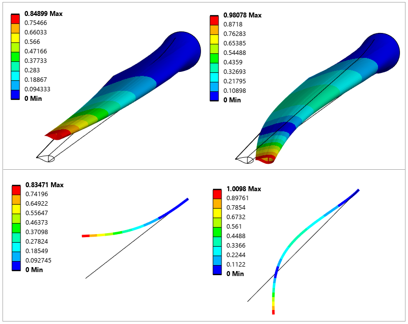The following figure shows a comparison of the mode shapes for the first and fourth frequencies.