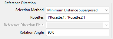 You can define the Reference Direction through Rosettes or tabular values. For a single element, the Reference Direction is determined by a projection of the Rosette’s X axis onto the element. For simple shapes and scenarios, a single Rosette can be sufficient for the Reference Direction definition. For more complex shapes (such as U-profiles) or a variation of the Reference Direction, select multiple Rosettes for a single OSS. For an example of multiple Rosettes, see Figure 2.73: Reference Direction of a Bonding Laminate Defined by Two Rosettes and a Minimum Angle Selection Method. Using multiple Rosettes requires utilizing the Selection Method to determine which Rosette is applicable to the location of the OSS. The Selection Method offers the following algorithms: