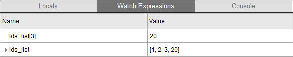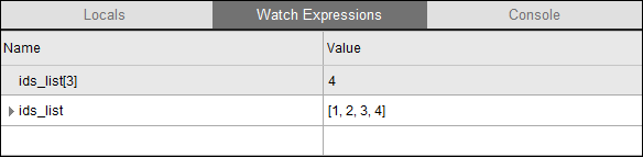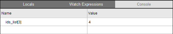Any variables that cannot be set in the Watch Expressions tab are grayed out. If an expression has a syntax error, the Value column displays the same compiler error as you would see when entering this command in the console.