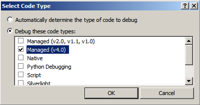 For the Attach to field, verify that the code type Managed (v.4.0) is selected.