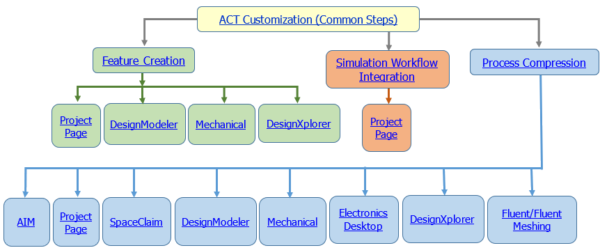 The next section describes the steps that are common to all extensions. Subsequent sections provide roadmaps and steps for each of the three customization types. Each section for a customization type provides information for the specific Ansys products that can be customized.