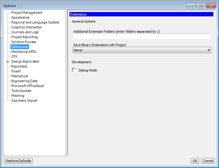 Contents Extensions | Print page Extension ConfigurationYou select Tools > Options > Extensions to configure ACT extension options. Descriptions of these options follow:Additional Extension Folders OptionSave Binary Extensions with Project OptionDebug Mode Option « Viewing Exposed Custom Functionality Additional Extension Folders Option »