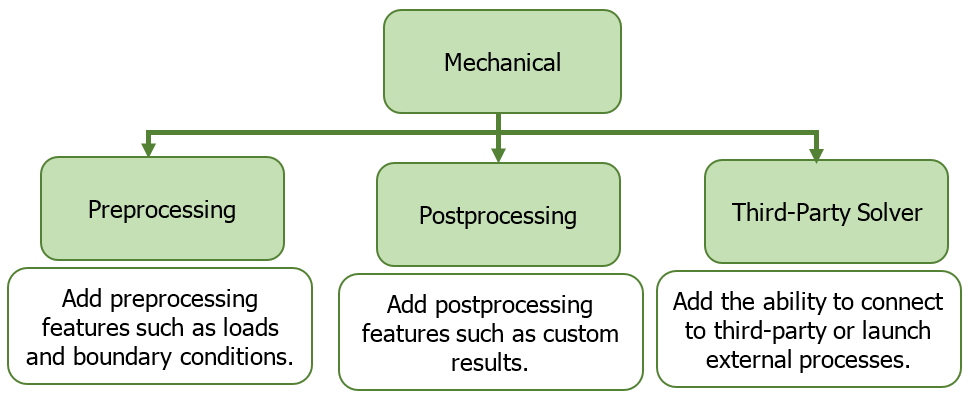 In Mechanical, you can create custom preprocessing, postprocessing, and third-party solver features.