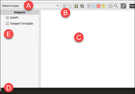 | B | Toolbar | Buttons for managing snippets and the command history. For more information, see Snippet Toolbar Buttons and Snippet Toolbar Buttons. |