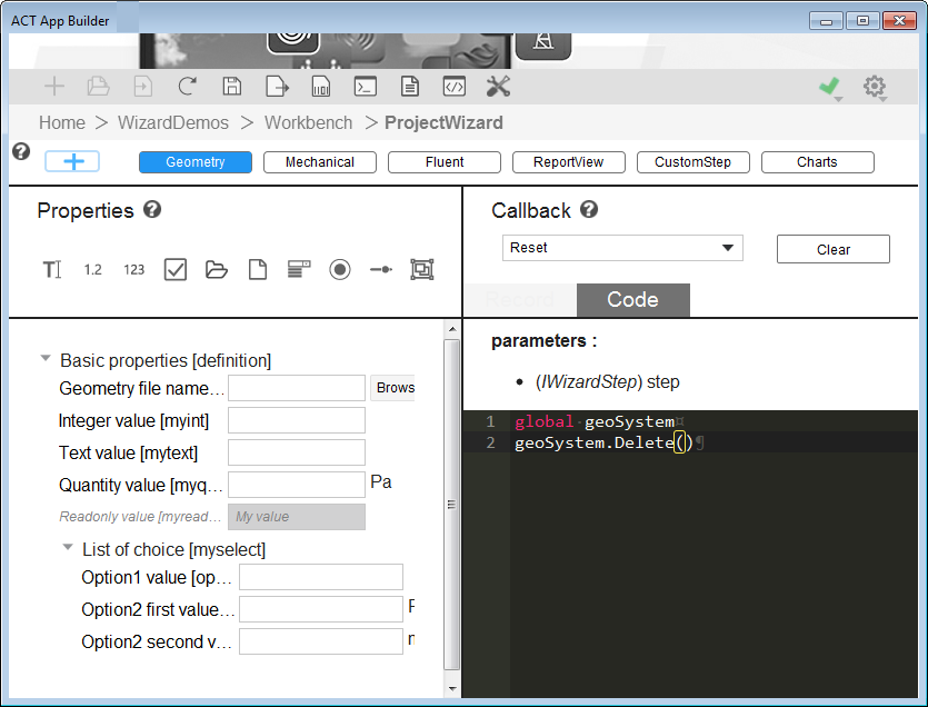 for the step Geometry and the code for the callback