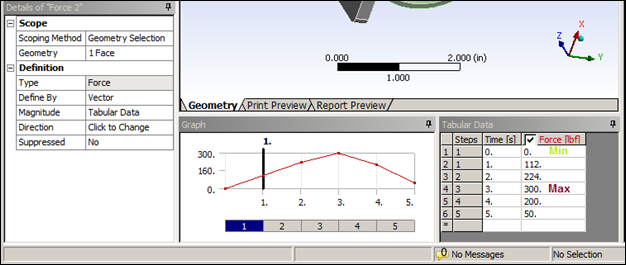 The Field API can be used to extract minimum and maximum tabular data for boundary conditions. For example, you can extract minimum and maximum applied force. The following figure displays tabular data for a force and highlights its minimum and maximum quantities.