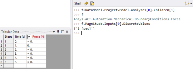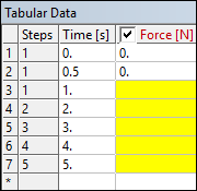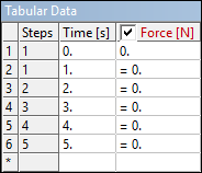 In the Tabular Data window, only six rows now show once again. The value =0 is actually a repeat of the value in the first row and does not correspond to an actual value stored for the variable. This is because the tabular data in Mechanical always displays a row for time values that correspond to step end times.
