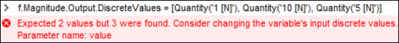 setbehavior according to the list content provided to the property.List Content Behavior None or null The variable is switched to the Free definition type if it is supported by the boundary condition. Otherwise, an error is issued. Single quantity object The variable is switched to the Constant definition type if supported in the interface. Otherwise, Constant (ramped) can be chosen. If neither of those two types are supported, Tabular Data is the default. Two quantity objects, with the first value being 0 The variable is switched to Constant (ramped) if supported in the interface. Otherwise, Tabular Data is the default. As many quantity objects as discrete values for the input variables The variable is switched to Tabular Data. Does not fall into any of the above categories An error is issued, indicating that you should either: The following figure shows a sample message.Provide the appropriate number of values.