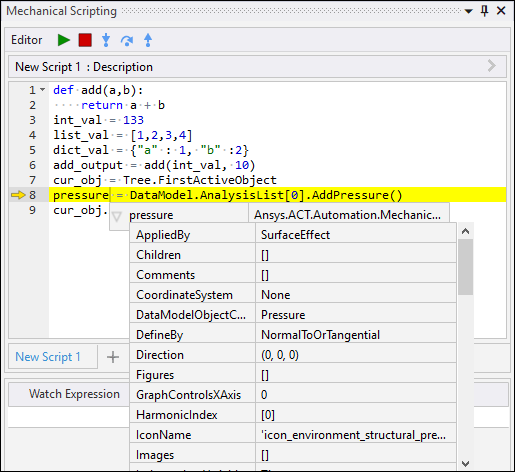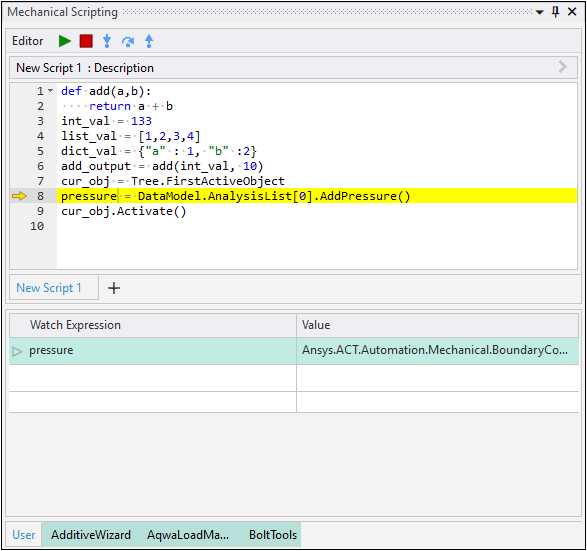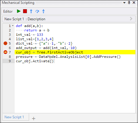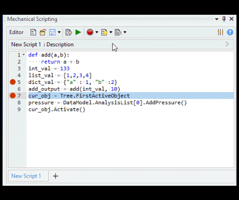 Important: Breakpoints pause the script execution. When paused, you cannot interact with the Mechanical user interface.