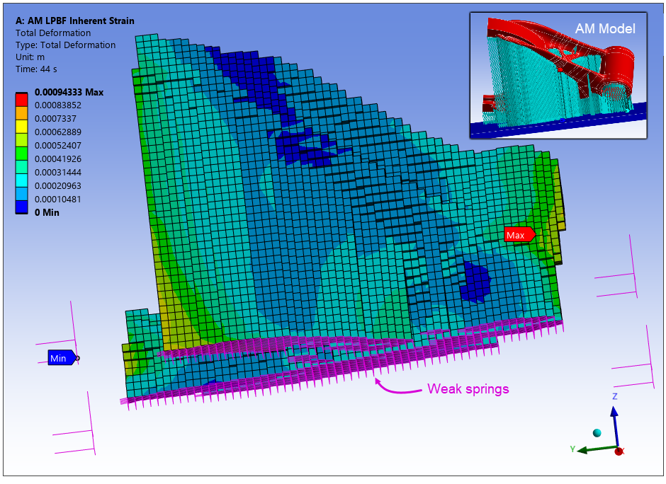As a first option, insert a Weak Springs object into an PBF Static Structural simulation to prevent rigid body motion when the default nonlinear stabilization is insufficient. In most cases, simulations should be able to reach convergence without this object, but it may be necessary on some occasions. When added, the object automatically scopes all nodes in the build at the interface of the parts/supports and the base. It attaches weak springs on the scoping (or a subset of the scoping) to hold the part in place without significantly affecting results.