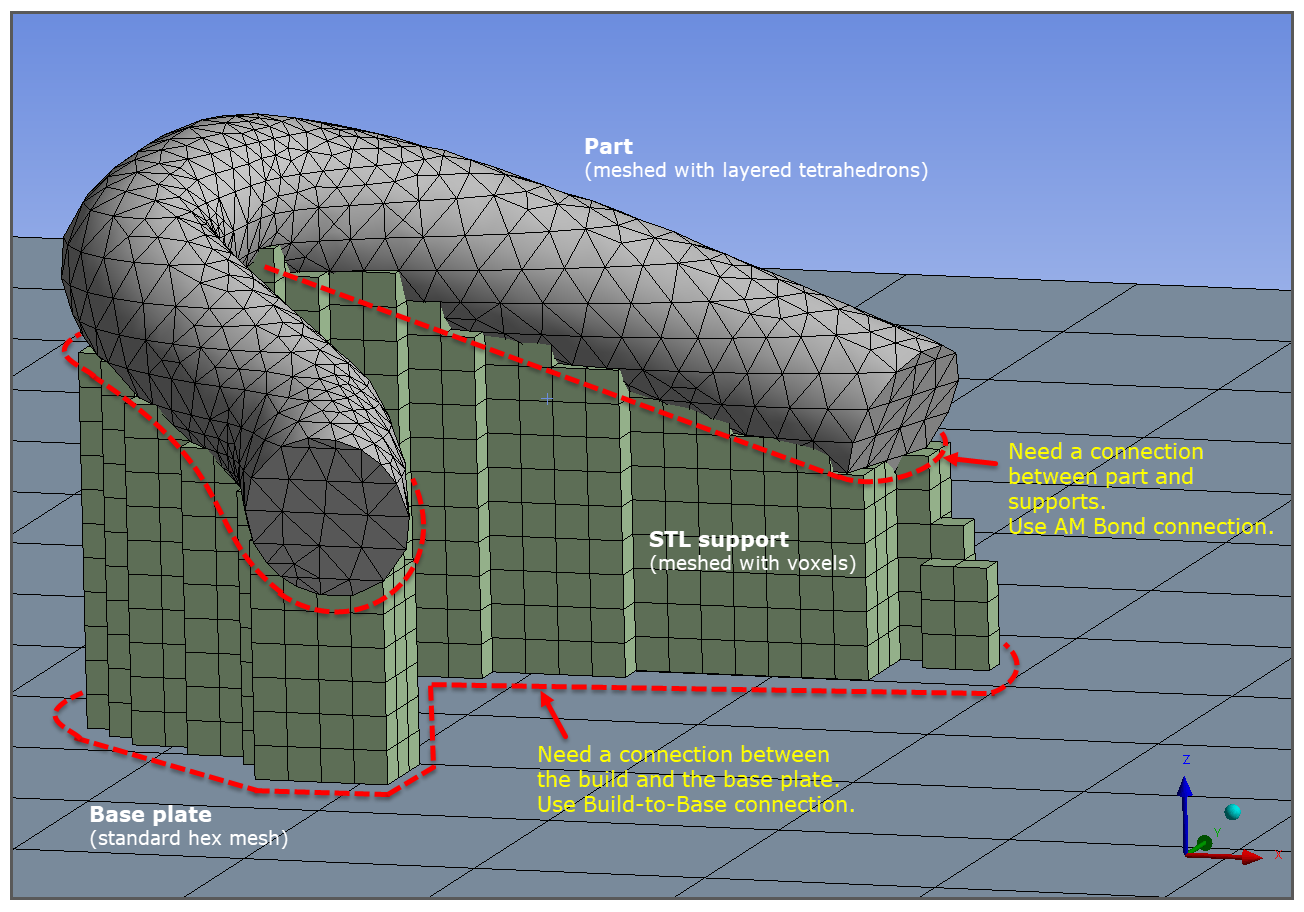 Certain mesh and support combinations in Mechanical result in conformal mesh between the part and the supports, in which connections are automatic by definition of a conformal mesh, while other combinations result in non-conformal mesh. In these scenarios you will need to create a contact connection between them with an AM Bond.