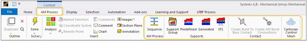 in the Define group. Or, right-click the Model object or in the Geometry window and select Insert > AM Process.Once you insert the AM Process object, certain automatic actions take place. The application automatically: